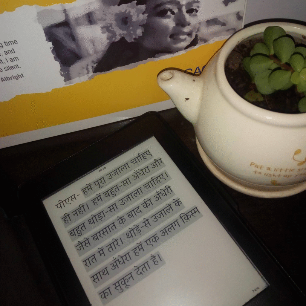 Somewhere in the end, Dubey writes about wanting to bring about a change in the world. I feel strongly that his work, this work, can be used for teaching in multiple ways. A particular instance which comes to mind is where Raghav is discussing his mother’s past relationships with his girlfriend (Nisha). The conversation between the two points out ways in which negotiation and communication can challenge patriarchy so strongly. There are other incidences where the ability to live a full life has been beautifully portrayed.